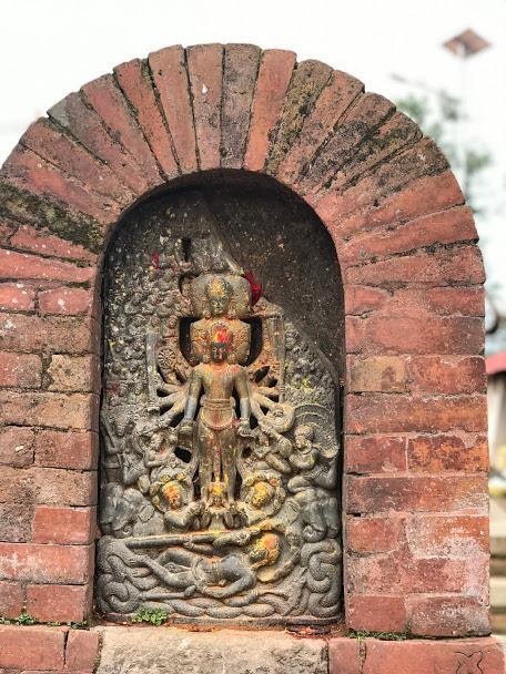 The stele (stone or wooden slab) of Vishworoop is placed on a very attractive and well carved stone platform. It depicts the scene of Bhagwat Gita in which Lord Krishna manifests his universal form to awestruck Arjun. Lord Krishna revealed his form of infinite mouths and eyes, adorned with divine ornaments and raising many celestial weapons. The detailed description of Vishworoop can be found in Chapter 11 of Bhagwat Geeta. He is decorated with divine garlands and garments and anointed with heavenly fragrances. This stele of Vishworoop is segmented into three levels, which represent the netherworld, the terrestrial world and the heavens. This sculpture from Lichchhavi period is extremely beautiful and thus, cannot be compared with any other sculpture.